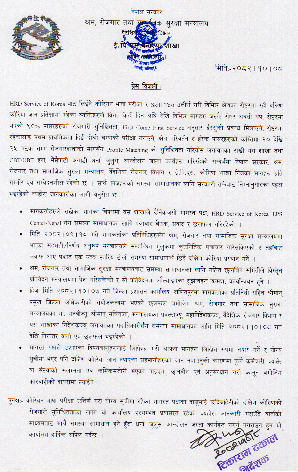 Revised २०८२ माघ १२ गते (26 Jan, 2026) मा कोरिया जाने कामदारहरुको सूचना ।