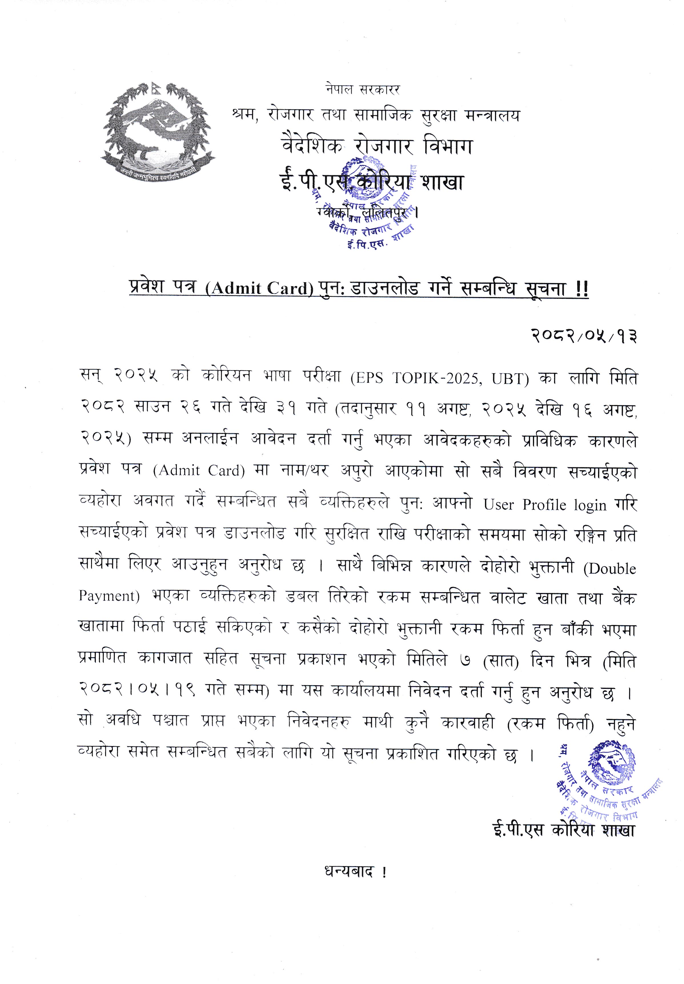 सन् २०२५ को उत्पादनमूलक (Manufacturing) क्षेत्र तर्फको कोरियन भाषा परीक्षा संचालन सम्बन्धी अत्यन्त जरुरी सूचना !!!
