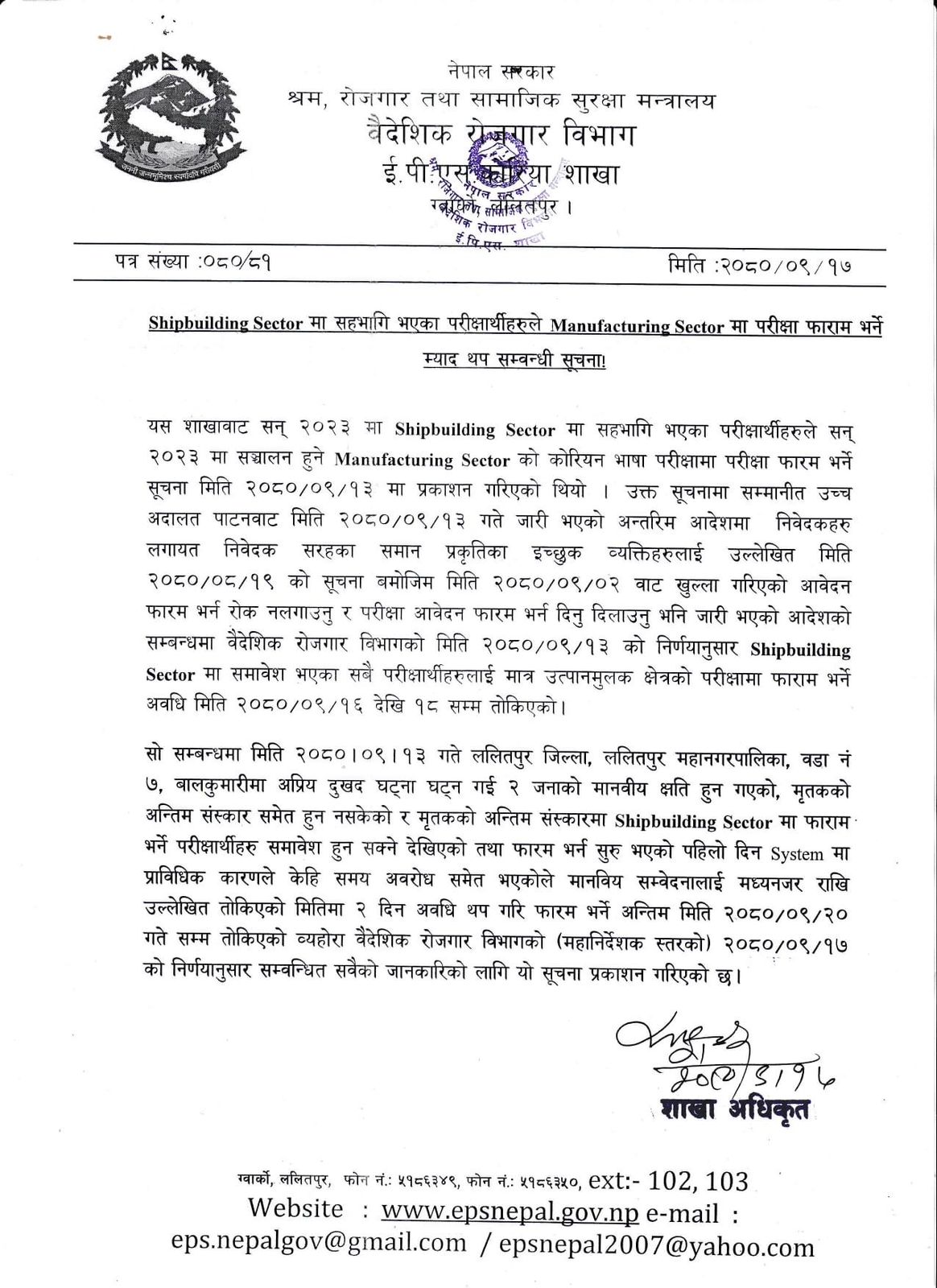 Shipbuilding Sector मा सहभागि भएका परीक्षार्थीहरुले Manufacturing Sector मा परीक्षा फाराम भर्ने म्याद थप सम्वन्धी सूचना!